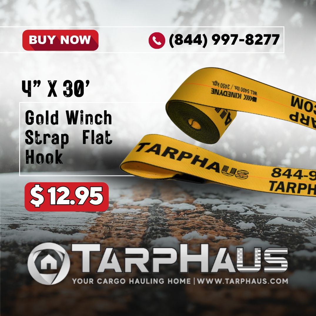 View full detailsSize: 4” x 30’ Color: Yellow End Fitting: Flat Hook Working Load Limit: 5,400 lbs Breaking Strength: 16,200 lbs Weight: 5 lbs Our TarpH...