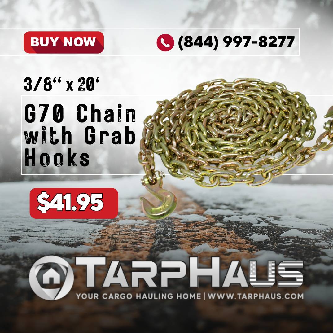G70 Transportation Chain w/ Grab Hooks Size: 3/8" Length: 20' Working Load Limit: 6,600 lbs Breaking Strength: 26,400 lbs Weight: 30.4 lbs Ma...