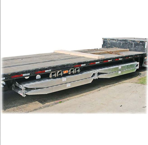 Store loading ramps below a truck trailer deck to save valuable space on a flat bed or step deck bed for hauling larger payloads. Ramp hanger brackets bolt to the trailer's underside for transporting custom loading ramp lengths and are designed to lock the ramps directly to the trailer for added security.